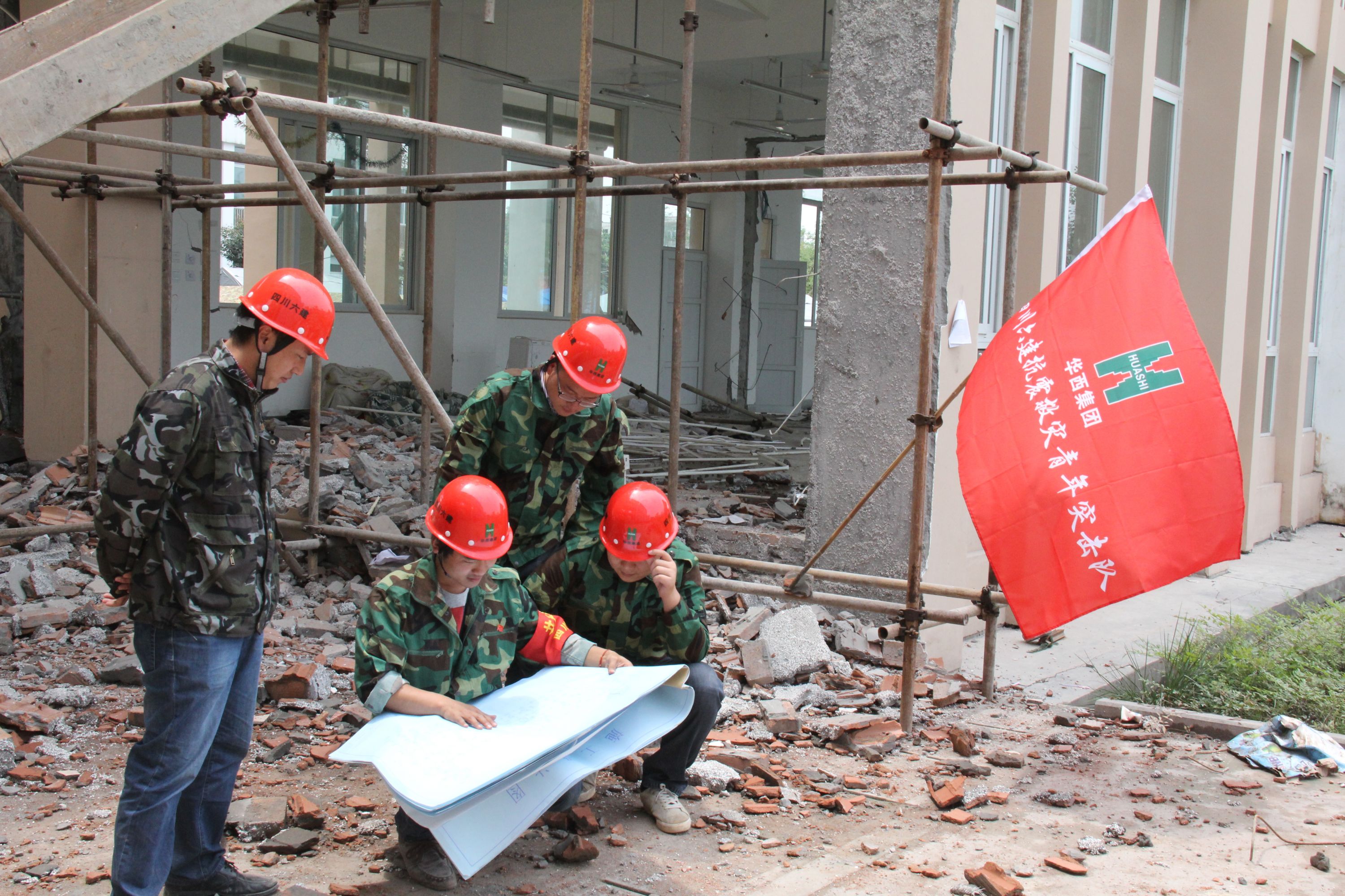 青年突擊隊在蘆山地震現(xiàn)場進行房屋鑒定工作